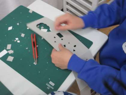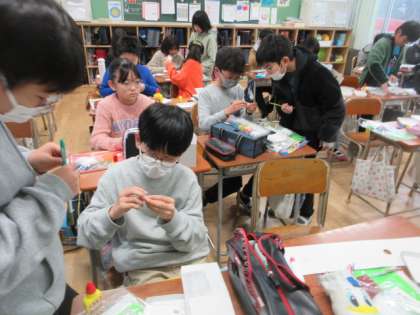 切り取った穴から箱の中をのぞくと,ひみつの景色が見えます。どんな景色が見えるのか,創造力を働かせて,制作しています。