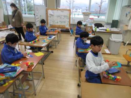わかくさ学級の子どもたちが,教室を飾り付ける,輪飾り作りをしています。どんどんつないで,きれいな輪飾りができています。