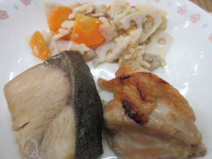 今日の献立は,チキンの照り焼き,または,ぶりの照り焼き・れんこんのきんぴら・沢煮椀(さわにわん)・麦ごはん・牛乳です。