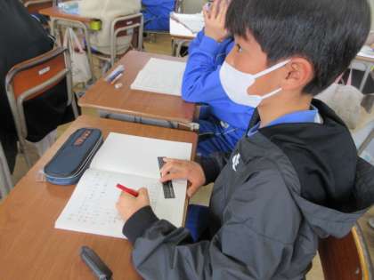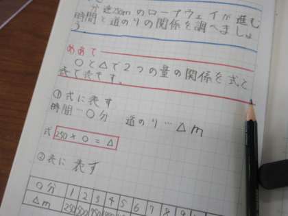 5年生の算数科では「変わり方」の学習を交換授業で進めています。今日は、5年2組の算数を3組担任の友江先生が交換授業していました。「一方が2倍、3倍すると、もう一方も2倍、3倍になっていきます。この関係を比例と言います。」子どもたちは、しっかりとノートに書き込んでいました。