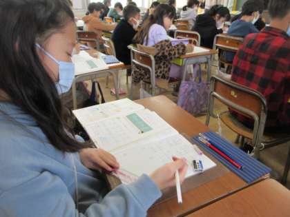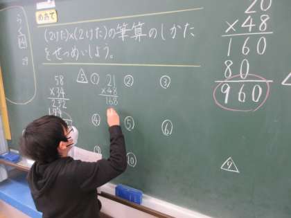 3年生の算数科では、「2けたをかけるかけ算の筆算」の学習を進めています。今日は、問題を解き、黒板に代表者が解答をかいて答え合わせをしていました。筆算式の位を間違えずにしっかりと解くことができました。