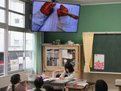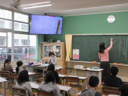 スーホの気持ちなどを読み取るため,大切な文章に線を引き,大型提示装置でみんなに見せながら,発表しています。