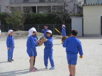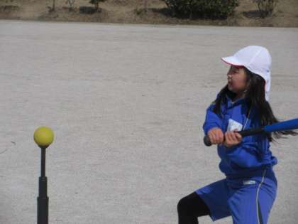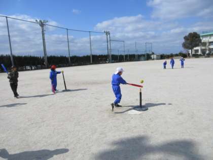 固定した台にボールを置き,バットで打つティーバッティングの練習をしています。守る子どもたちは,交代で,大谷グローブをはめて守っています。
