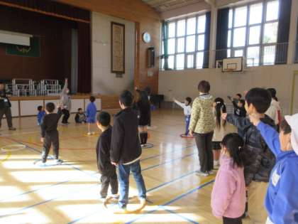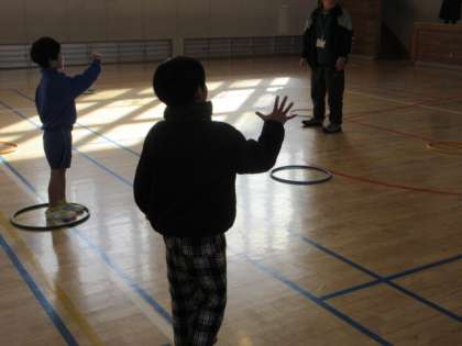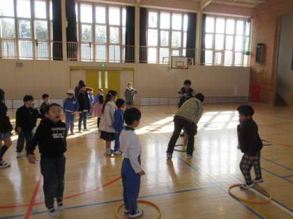 わかくさ学級では,低学年の子どもたちと6年生の子どもたちが,体育館でレクレーションを楽しんでいます。じゃんけんに勝つと,並んだ輪を一つずつ進んでいくゲームのようです。