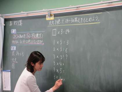 3年生から,わり算の学習がはじまりました。九九をもとにしたり,実際にブロックを分けたりしながら,答えを導き出しています。