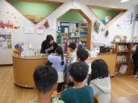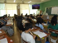 いろいろな色や形の英語についての学習です。赤い三角形,青いハート,黄色い星など,いろいろな色の形を組み合わせて,タブレットで絵を描いています。