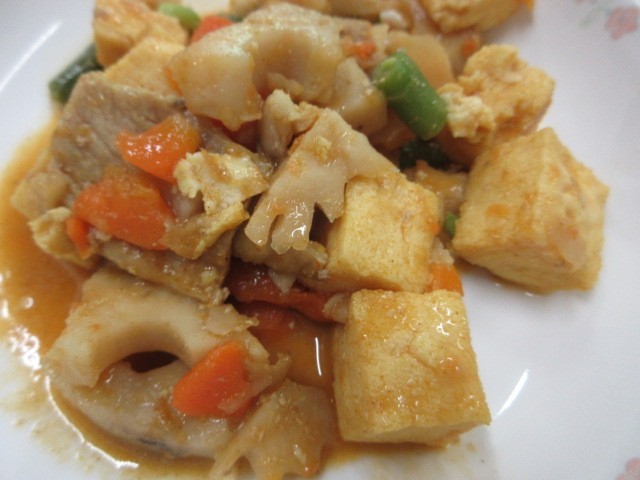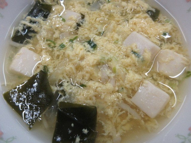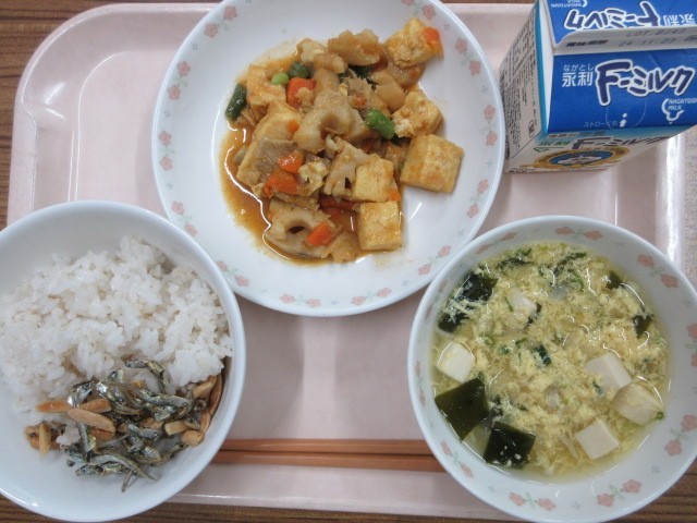 今日の献立は,厚揚げとれんこんのカレー炒め・かきたま汁・アーモンドいりこ・麦ごはん・牛乳です。