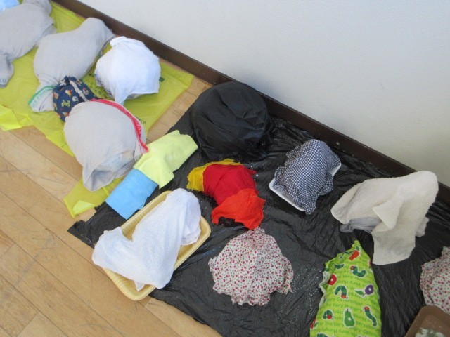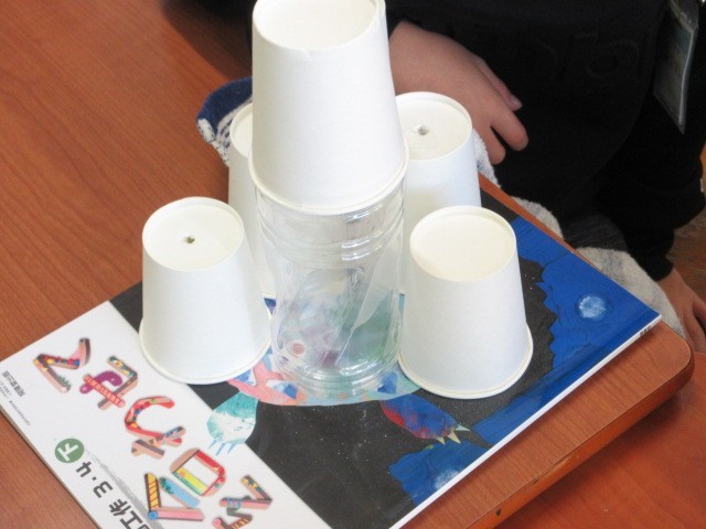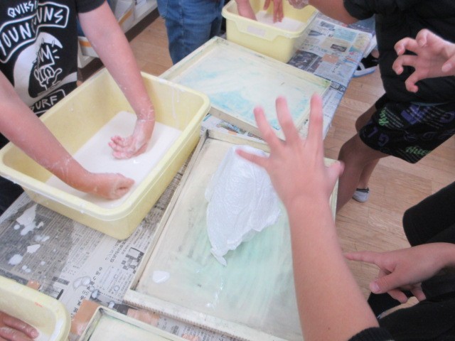 紙コップ,新聞紙,ペットボトルなどで型をつくり,白い液体粘土しみこませた布をからめていきます。どんな作品が完成するのかが楽しみです。