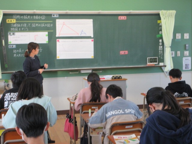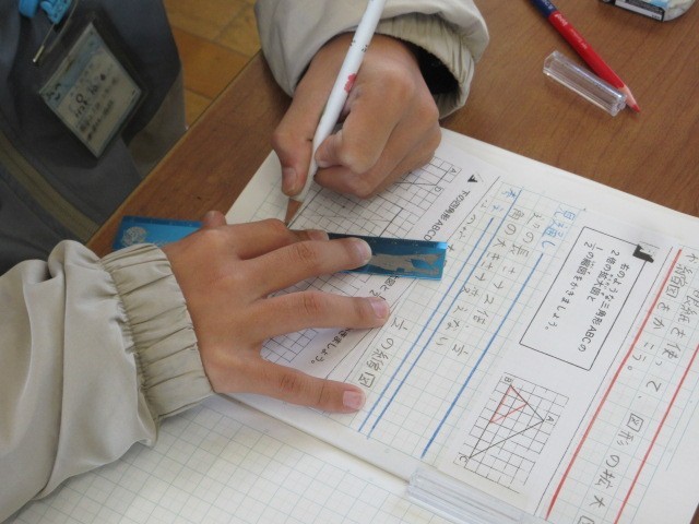 「図形の拡大と縮小」の学習の様子です。基本となる三角形や四角形を,2倍に拡大したり,2分の1に縮小したりした図形を作図しています。6年生は,さすがに作図も正確です。