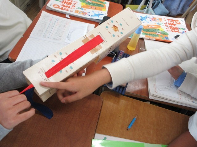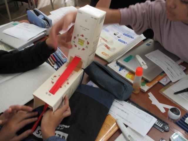 2つの牛乳パックを組み合わせた,手作りの実験装置です。筋肉を収縮させて腕をまげる様子を再現した実験をしています。