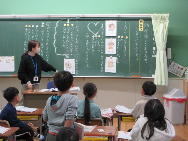 学校の帰り道に,置いてある自転車のために通れなくて困っているおじいさんに出会いました。自分だったらどうするでしょうか。親切な心について,しっかり話し合っています。