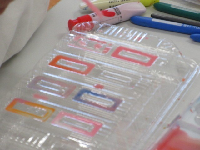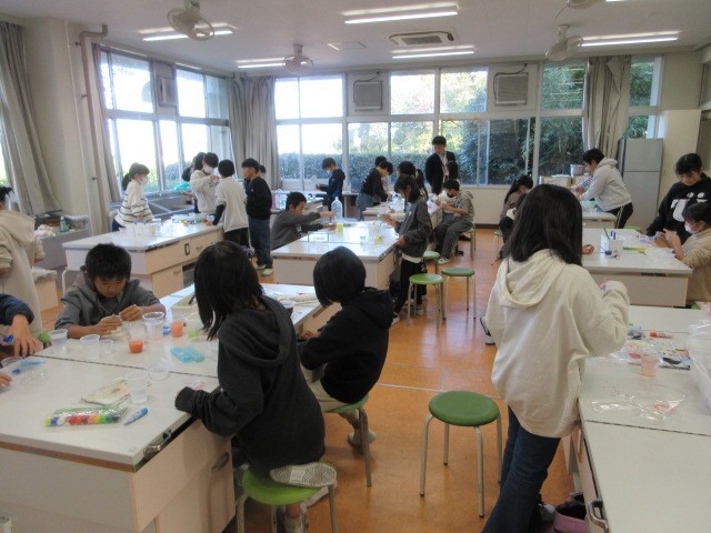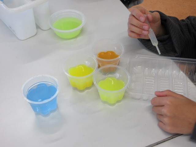 5年生が,家庭科室で,図工の勉強をしています。スポイトを使って絵の具を水にとかし,色水を作って並べる,造形遊びの学習です。