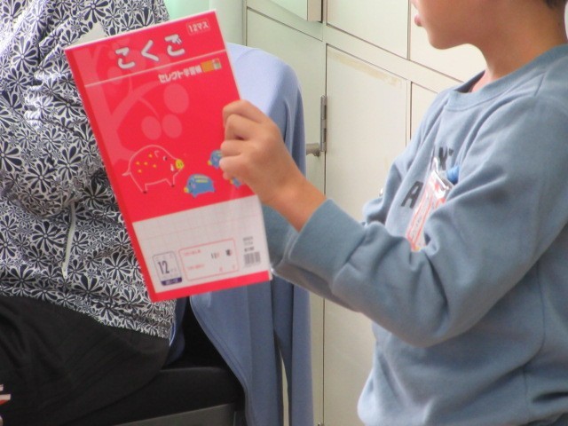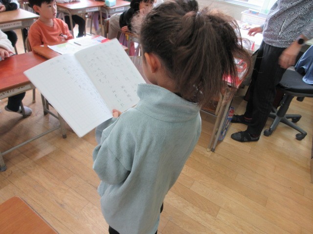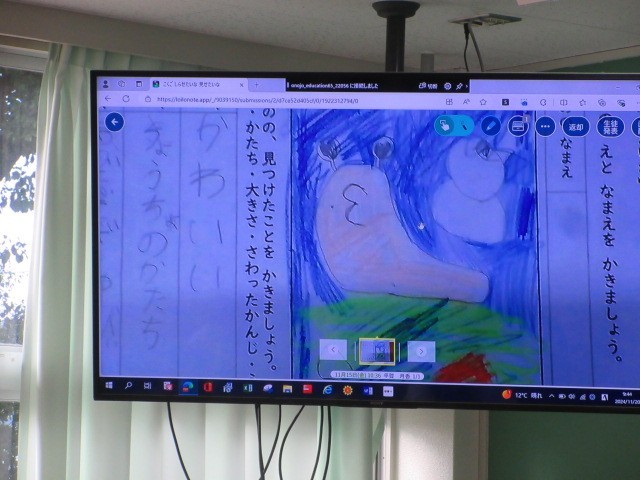 「しらせたいな,見せたいな」で書いた作文を,一人一人,発表しています。自分で描いた絵やメモが,大画面に映し出されています。