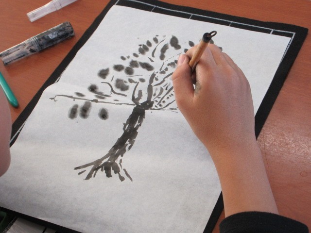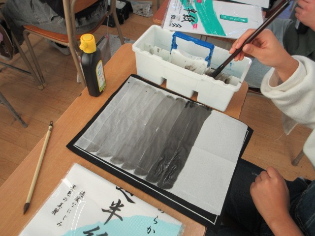 墨の濃淡を生かして,墨絵に表現する学習です。濃淡のある線の練習をした後,それぞれが好きな絵を描いています。
