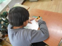 大きな画用紙に,ふわふわの白い綿をはりつけています。そこに,画用紙に書いた自分の絵もはりつけて,くじらぐもの完成です。
