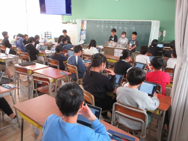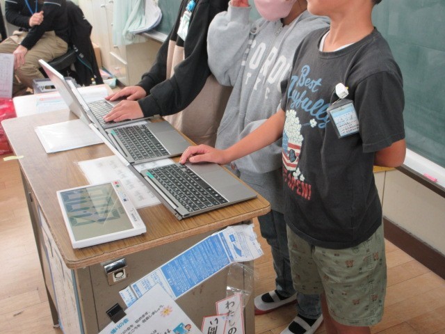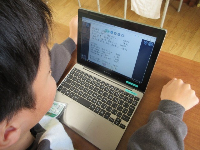 各クラスでも,ひらのっこフェスタの練習に取り組んでいます。タブレット画面の呼びかけの言葉を確認しながら,代表の子どもの進行で練習を進めています。