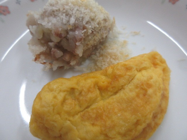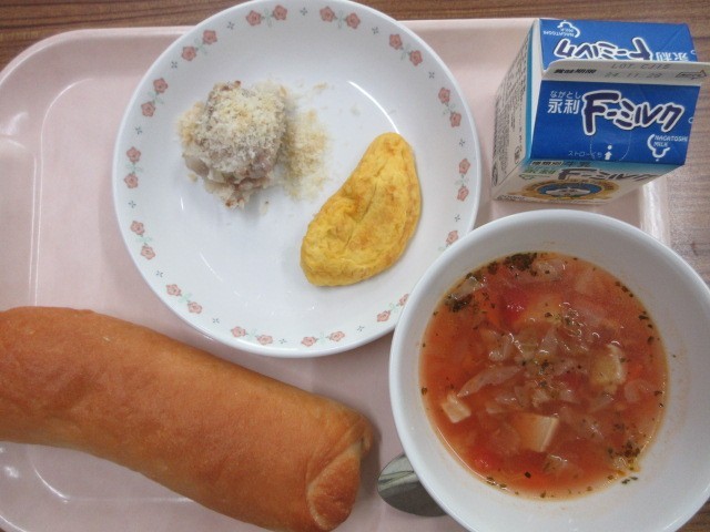 今日の献立は,スコップコロッケ・プレーンオムレツ・ミネストローネ・米粉パン・牛乳です。