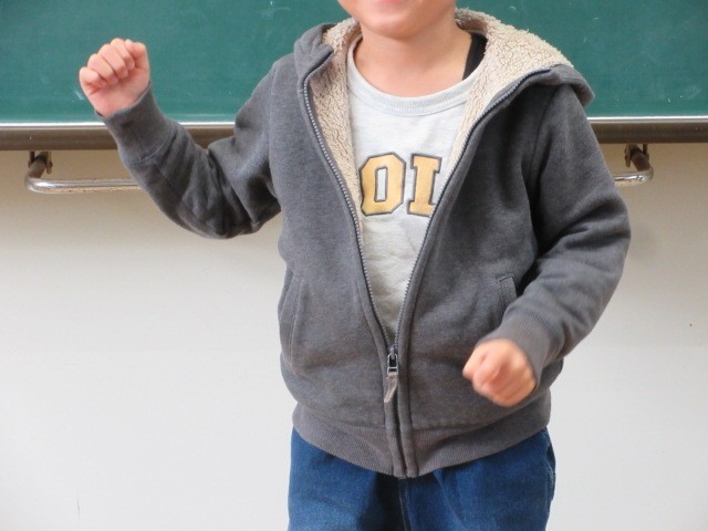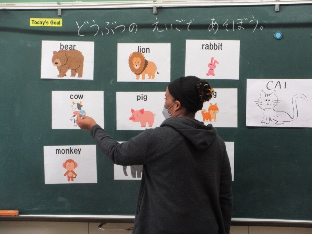 動物の英語を使ったいろいろなゲームに,歓声があがっています。動物の声や動きを真似して,何の動物かあてっこをしています。