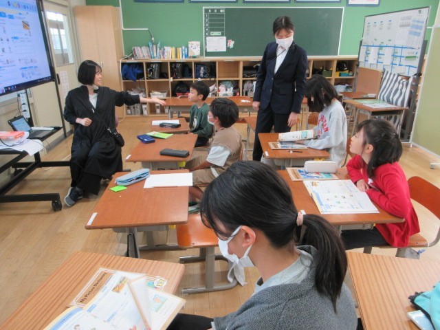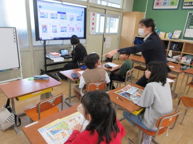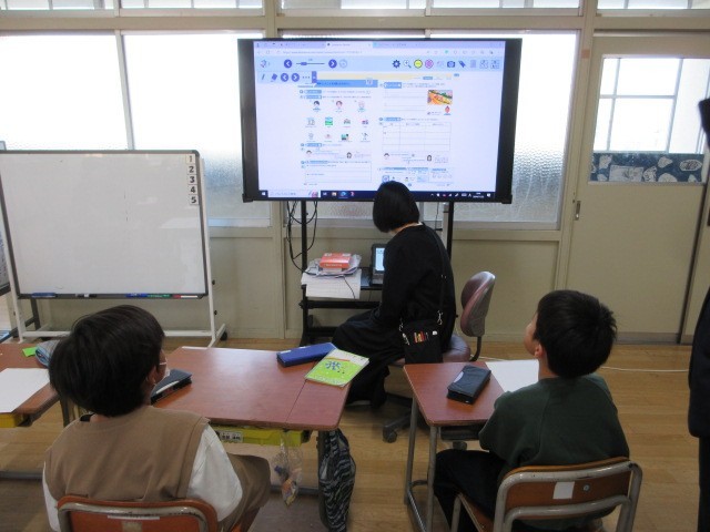 わかくさ学級での,英語の学習の様子です。少人数の中,先生と子どもたちが,英語でやりとりを交わしながら学習しています。
