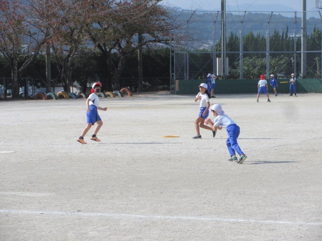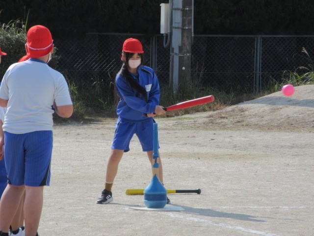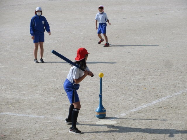 さわやかな気候のもと,運動場で「ティーボール」の試合を楽しんでいます。自分たちで試合をしながら審判ができるように,ルールが工夫されています。