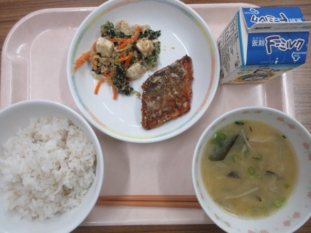 今日の献立は,ほうれんそうと豆腐のごま和え・さわらの竜田揚げ・玉ねぎの味噌汁・麦ごはん・牛乳です。