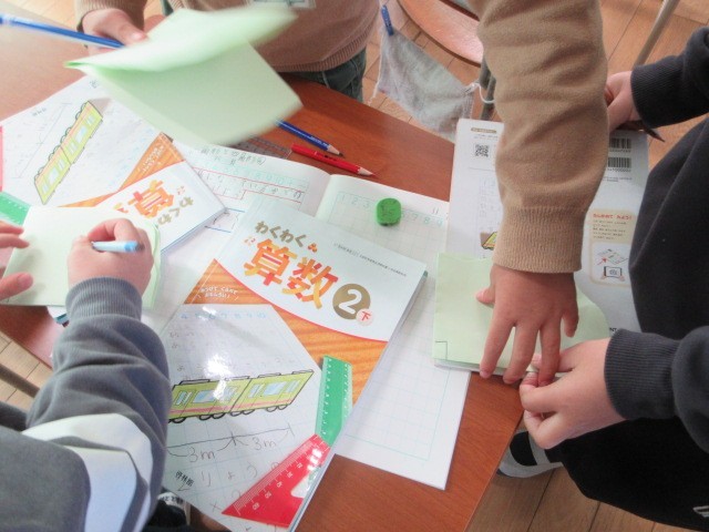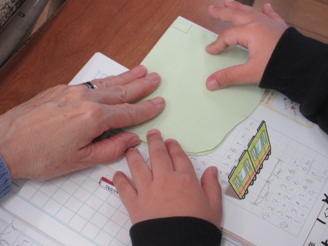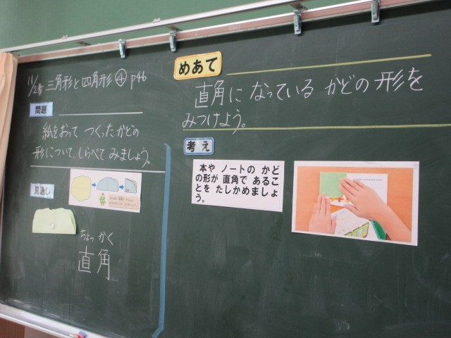 「三角形と四角形」の学習で,「直角」の意味について学んでいます。紙を折って直角をつくり,ノートや教科書の角に合わせてみました。