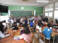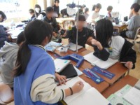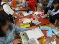 いろいろな色のお花紙を手でちぎり,大きなビニールの上でランダムに重ね合わせて並べます。その上から,のりを溶かした水をかけて押さえます。水がかわくと,きれいなお花紙模様の出来上がりです。