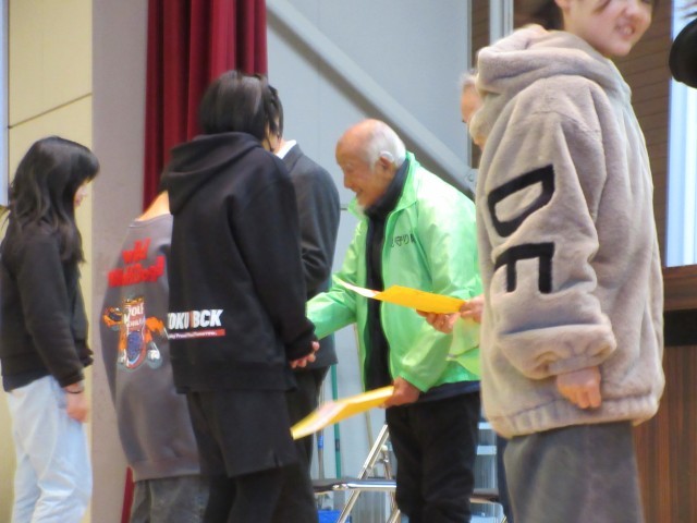 「見守りボランティア感謝の会」での,感謝状贈呈やお礼の言葉,校歌斉唱の様子です。