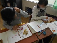 理科「音のふしぎ」の学習の様子です。小太鼓の上にビーズを入れた容器を置き,小太鼓をばちで叩いてビーズの動きを観察しています。また,箱にかけたゴムを手で弾いて音を出し,ゴムの震えを観察しています。