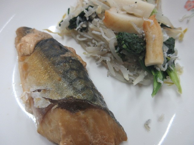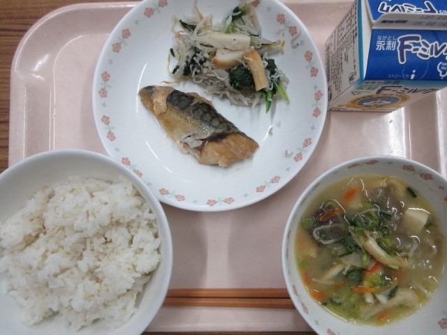 今日の献立は,さばの煮付け・もやしとじゃこの炒め物・豚汁・麦ごはん・牛乳です。