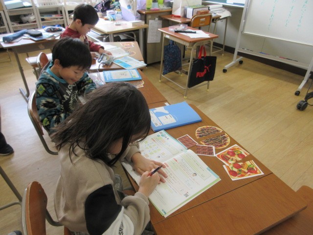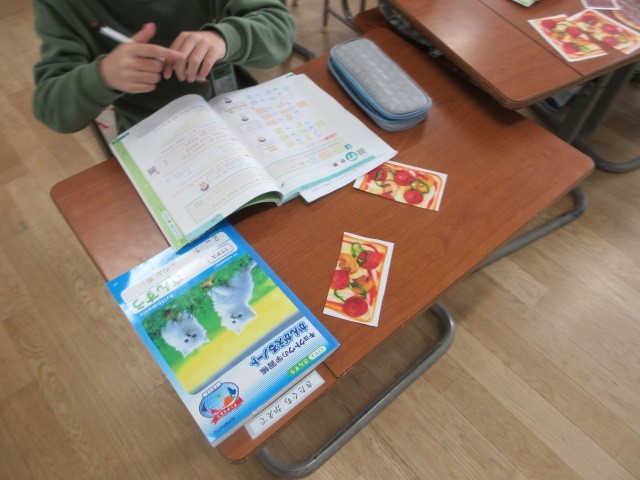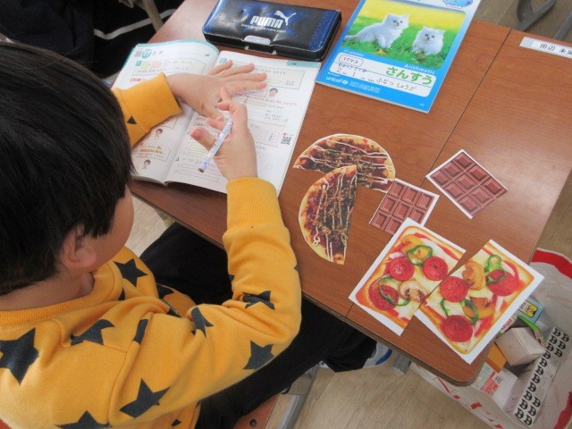 わかくさ学級の2年生が,分数の学習をしています。2分の1(はんぶんこ)の意味を,ピザ・お好み焼き・チョコレートの絵を切り分けて,考えています。