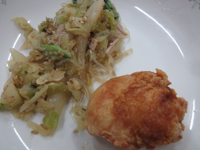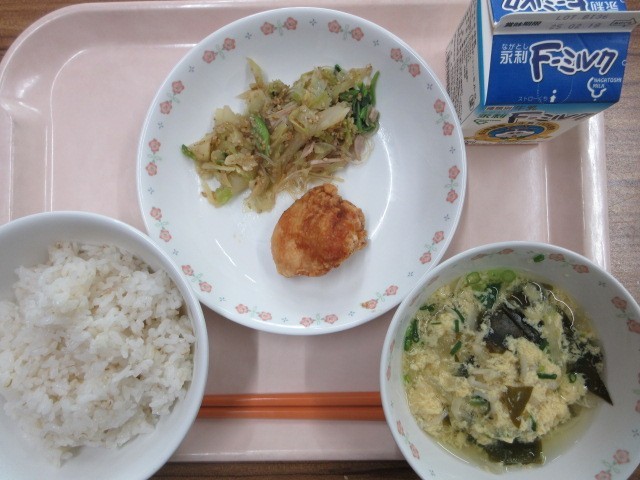 今日の献立は,チキンの甘唐揚げ・春雨の炒め物・かきたま汁・麦ごはん・牛乳です。