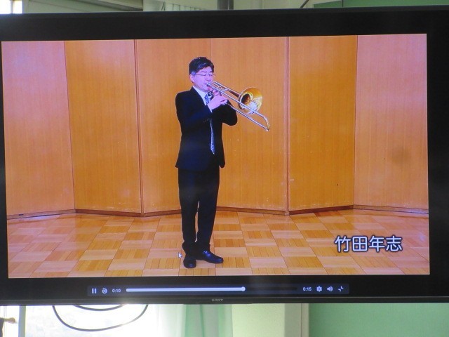 ハチャットゥリアン作曲「つるぎのまい」の鑑賞をしています。ティンパニ,木琴,トロンボーン,サクソフォーン,チェロなど,演奏に使われている楽器の音色に気を付けて聴いています。