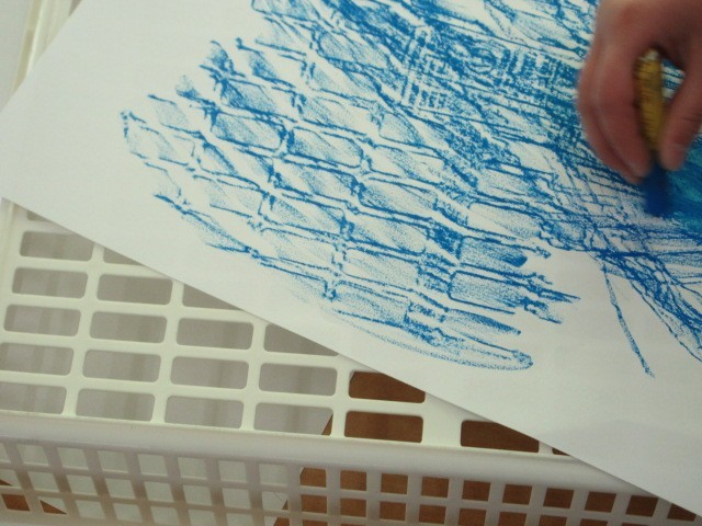 画用紙を,表面に凹凸のあるものの上にのせ,上からクーピーやクレヨン,チョークなどでこすると,模様が浮かび上がってきます。プラスチックかご,連絡袋,窓ガラス,空気のプチプチなどの模様写しを楽しんでいます。