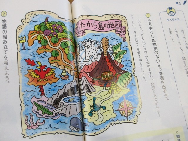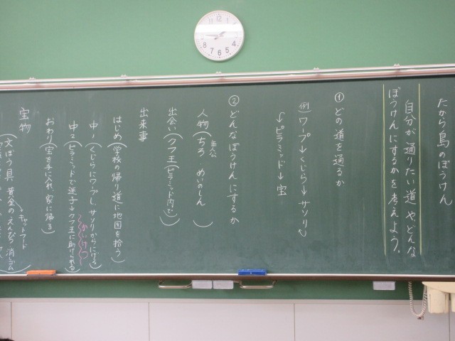 一枚の「たから島の地図」が想像を広げて,自分だけの冒険物語を書いていく国語の学習です。まずは,どんなお話にしたいか,イメージを広げたり構想を練ったりしています。