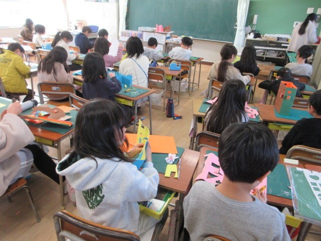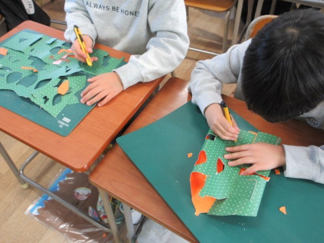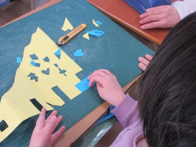 カッターナイフを使って,「まどのある たてもの」を制作しています。たくさんの窓,いろいろな形の窓があります。