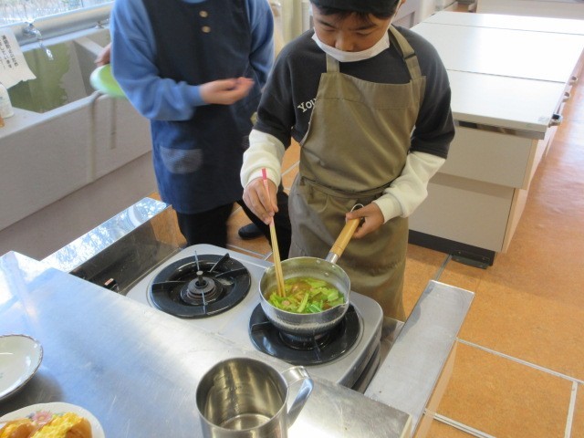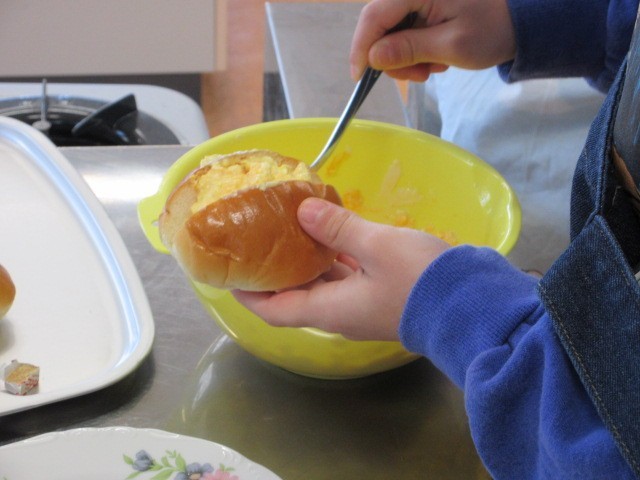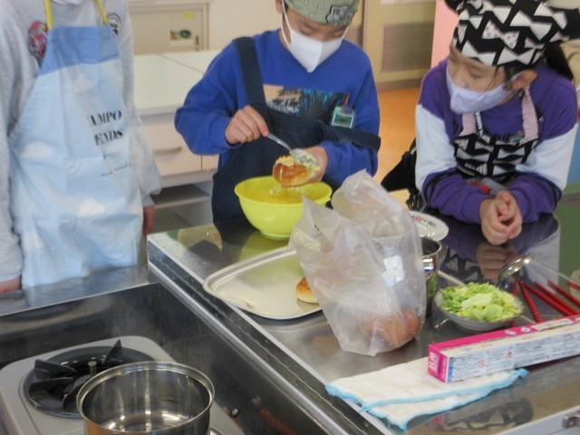 わかくさ学級の子どもたちが,エッグサンドと野菜スープの調理実習に取り組んでいます。朝食向けの献立は,家でも実践できそうです。
