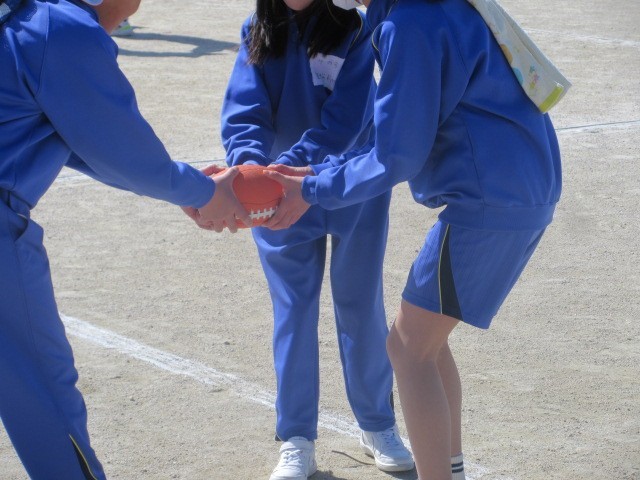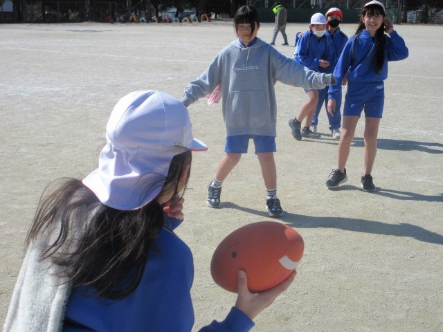 小さなラグビーボールを使った,「フラッグフットボール」のルールにも慣れてきました。動きや作戦を工夫しながら,ゲームを楽しんでいます。