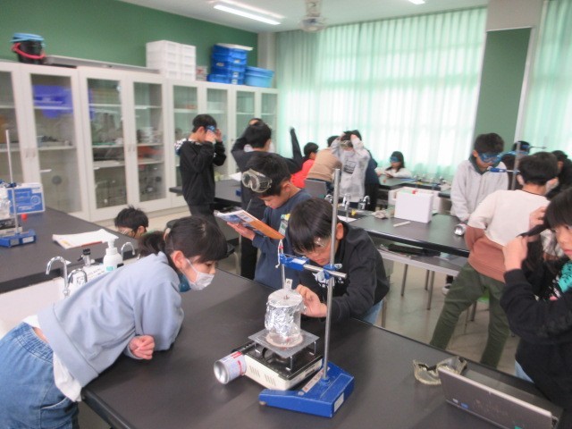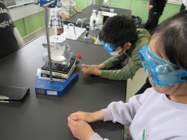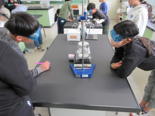ビーカーの水を熱し続けると,水の温度はどのように変化していくのかを調べています。同時に,ビーカーがくもったり,泡や湯気が出たりする様子も,観察しています。