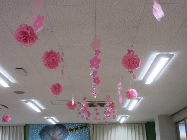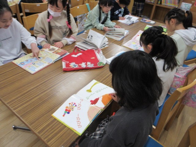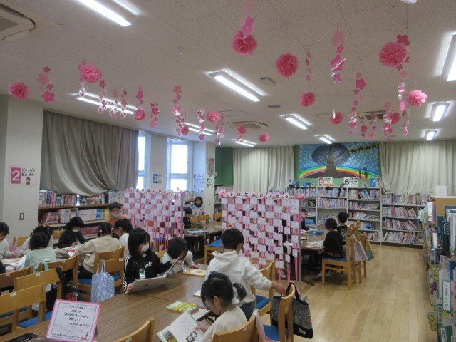 図書室を利用する,週1回の読書の時間です。今,図書室は,ピンクの花々でとても華やかです。