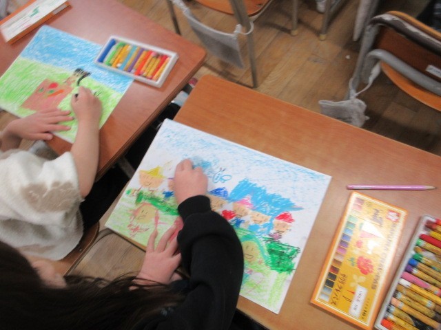 1年生で思い出に残っていることを,絵に描いています。運動会・遠足・くじらぐもの発表・給食・プールなど,思い出がたくさんできた1年生です。