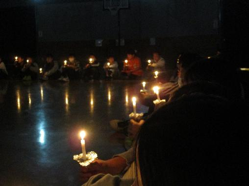 午後からは、野外炊飯です。協力してカレーライスをつくります。野菜を切る係、お米を準備する係、薪で火をおこす係がそれぞれ力を合わせて、カレーライスができました。自分たちで苦労して作ったカレーはとてもおいしく、みんなどんどんおかわりしてました。施設に戻って、お楽しみのキャンドルの集いです。キャンドルに火をともして、静かに自分を見つめる時間とレクリエーションで思いっきり楽しむ時間がありました。メリハリをつけて、仲間と一緒に楽しむことができました。