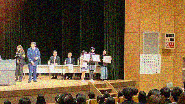 大城小学校からは、3名の子どもが表彰されました。約1年間、毎朝、通学路のごみ拾いを続けている子たちです。約60名の表彰者がいる中、表彰の順番が一番最初だったこともあり、3名はとても緊張していましたが、立派に表彰状を受け取り、会場の皆さんへ披露することができました。とても嬉しそうな表情でした。