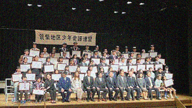 善行者表彰式が筑紫野市生涯学習センターで開催されました。善行者表彰は、教育委員会、学校、警察、企業等で組織された筑紫地区少年愛護連盟という団体が主催しています。「善い行いをした児童生徒」に贈られる表彰です。善い行いの主な対象は、社会や地域のためにし続けている行い、人命救助にかかわる行いなどです。