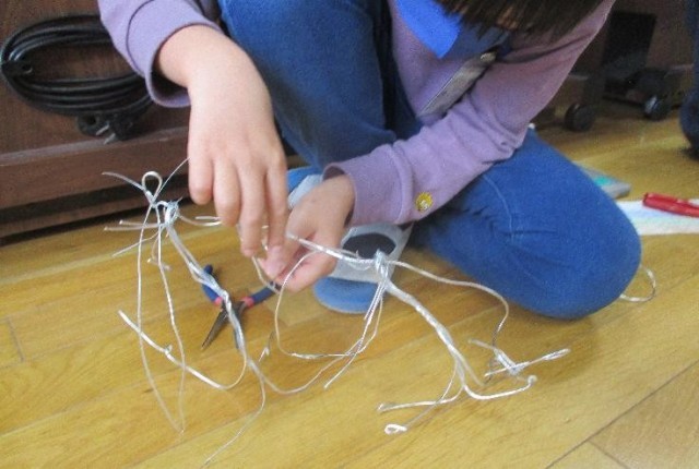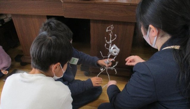 はり金という単一の材料でも、その特徴を生かして工夫することで、美しい形を生み出すことができます。そのはり金で、子どもたちは、表したい感じが出るように、曲線をつくったり、余白をつくったり、密集させたりなど、試行錯誤しながら作品作りをしました。途中、互いの作品を鑑賞し合ったり、先生からアドバイスをもらったりして、作品作りのよい刺激ももらっていました。