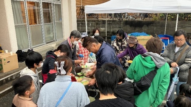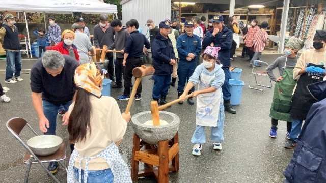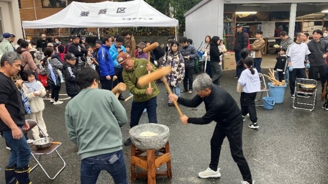 年末恒例の釜蓋区の餅つきが行われました。公民館横のスペースで、蒸し器でもち米を蒸し、石臼と杵を使った本格的な餅つきでした。大城小、大野東中からも、たくさんの子どもたちが餅を袋詰めする等のお手伝いをしに参加していました。子どもたちは餅つきの体験もさせてもらい、とても満足そうでした。つかれた餅はその場で、きなこ餅、おろし餅に調理されて、参加者にふるまわれました。参加した皆さんは、つきたてのお餅をとてもおいしそうにいただいていました。