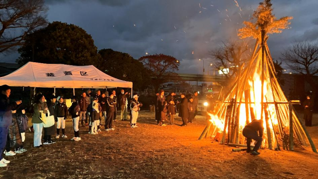 釜蓋区「ほんげんぎょう」が木町公園で行われました。「ほんげんぎょう」とは、お正月飾りや書き初めなどを青竹やわらで組んだやぐらに集めて燃やし、五穀豊穣と無病息災を願う九州地方の伝統行事です。