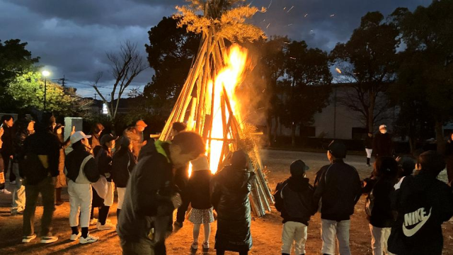 やぐらへの点火はまだ薄暗い早朝7時でしたが、多数の地域の方や子どもたちが参加して盛大に行われました。参加者は、やぐらから舞う大きな炎を見つめながら、今年の健康や発展など様々なお願いをしました。伝統を大切にして発展を願う地域の方々の強い思いを感じました。令和8年が、地域や大城小学校にとって幸多き年になることを願っています。