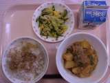 麦ごはん 牛乳 肉じゃが 茎わかめのサラダ じゃこふりかけ