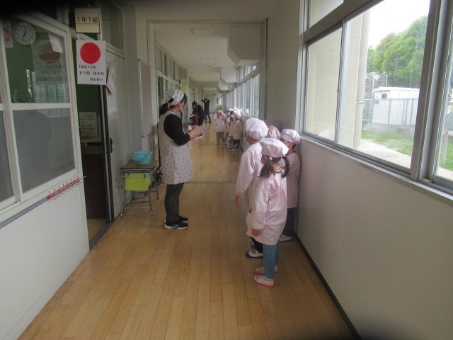 担任の先生方から給食当番の仕事をしっかりと教わる1年生。